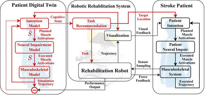 中风康复帮助患者恢复因脑损伤丧失的运动控制。机器人辅助康复可减轻治疗师负担并提高效率。团队基于神经肌肉骨骼模型构建患者数字孪生,利用康复机器人采集的运动轨迹与力信息推断可能的肌肉激活序列,从定性与定量角度评估患者动态与静态运动控制,并据此建议新的运动目标以降低不确定性、提升康复效果。