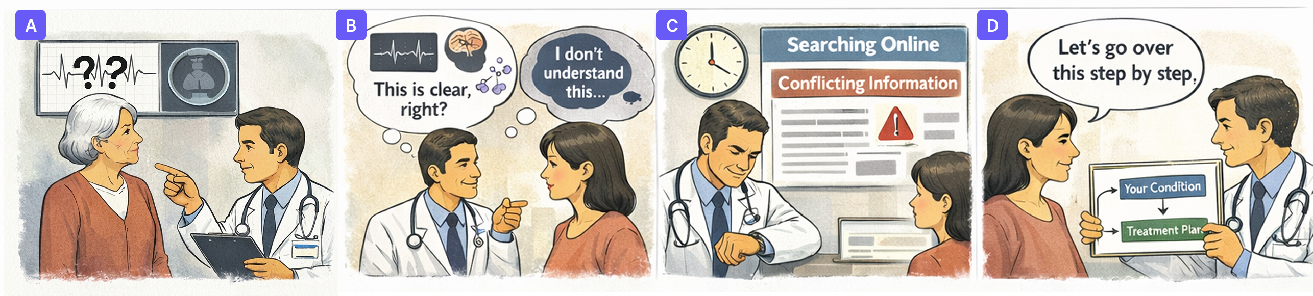 DIS Y. Jin, S. Zhang, D. Chen, Y. Ouyang, Y. Shao, C. Jiang, H. Li, and Q. Li. MediMate: Co-Crafting Patient-Centered Medical Explanations Using LLMs as a Rehearsal Partner. In Proceedings of the ACM DIS Conference (DIS'26). |