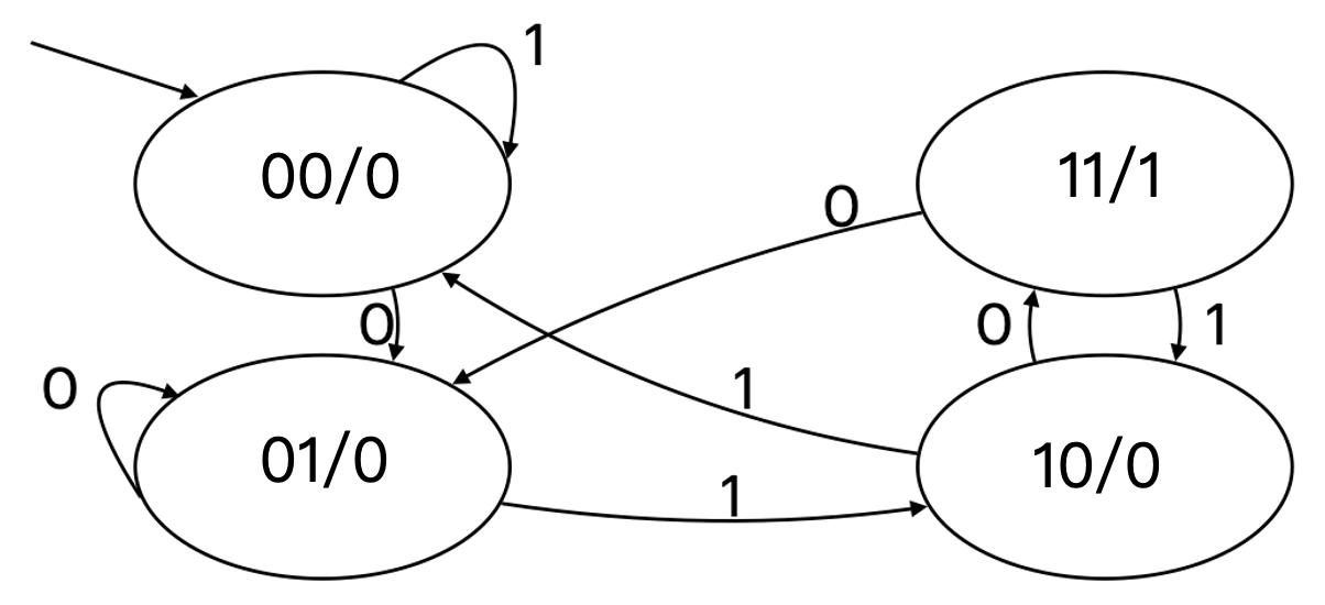 Note that the FSM is implemented by the following diagram (the four state names 00, 01, 10, 11 are just names written in binary - they have no direct relationship with the actual zeros and ones of the FSM input/output). Take some time to understand how this diagram implements the FSM.